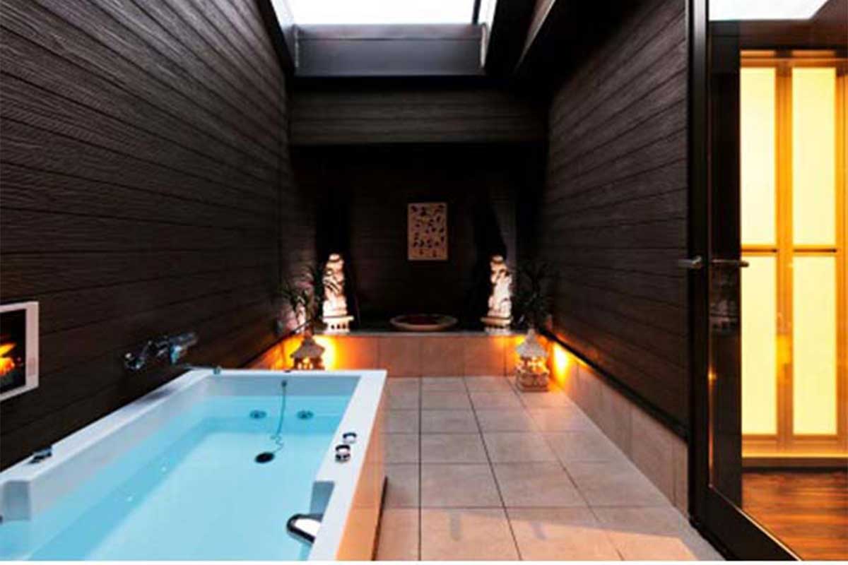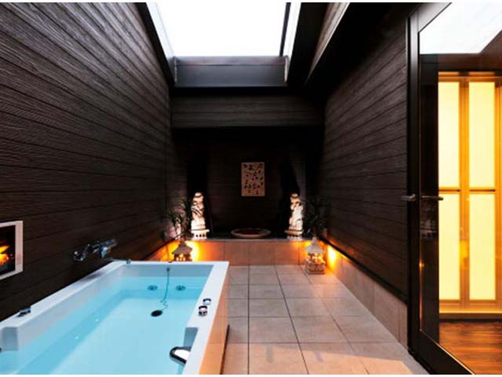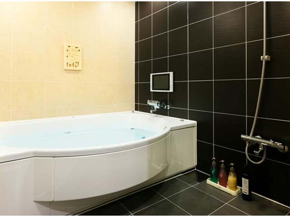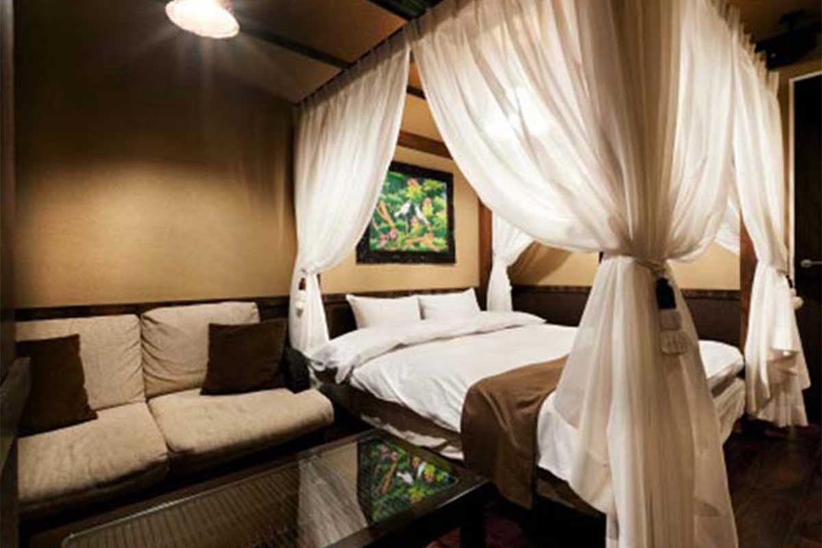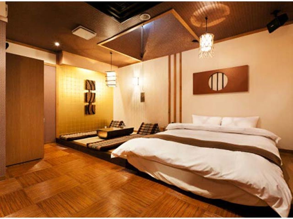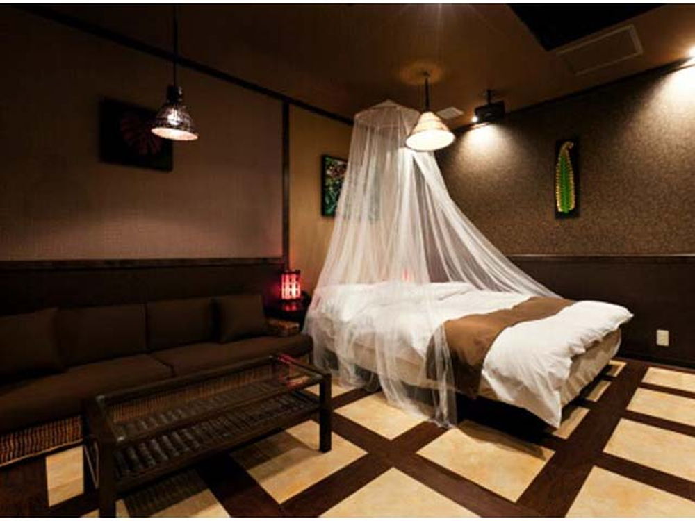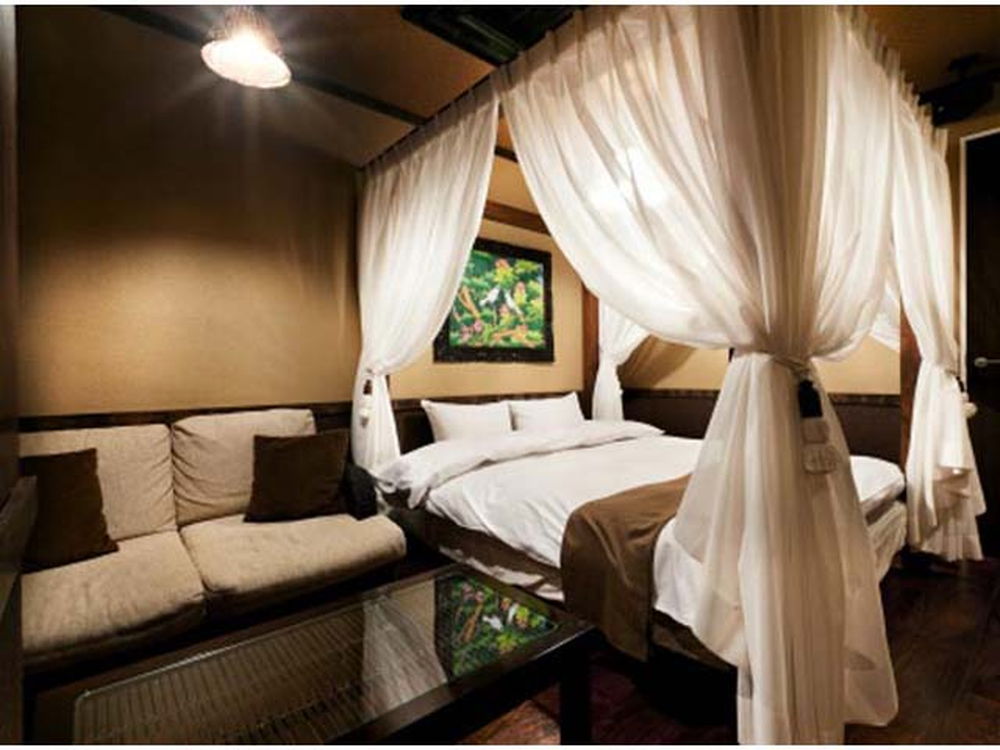 無料Wi-Fi、無料駐車場、50インチTV、VOD、ジェットバス、露天風呂(一部)を完備。和ジアンな落ち着いたデザインと天蓋ベッドが人気。